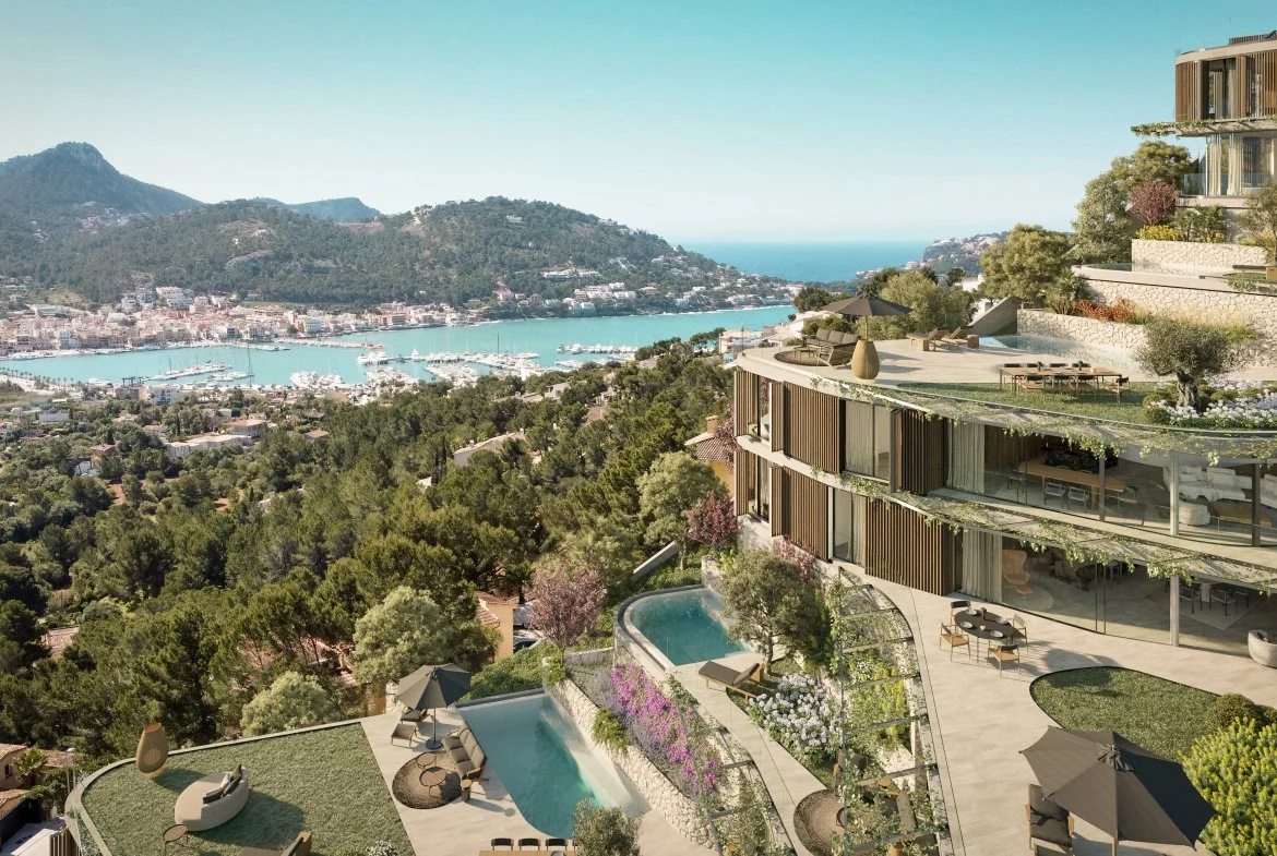 Andratx Hills, also referred to as the architectural gem of Port d’Andratx, consists of nine luxury units of highest international standard situated just a few hundred meters above Port d’Andratx. Nestled into the hills looking over the harbor and mountains with its organic architectural shape carved out of wood, glass and concrete, it will become something you have never seen before in Mallorca.